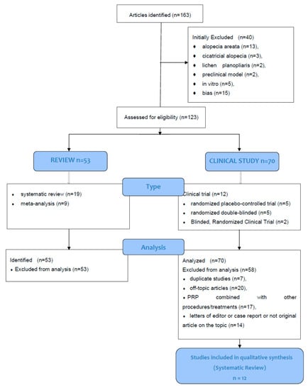 Gentile, P.; Garcovich, S. Systematic Review of Platelet-Rich Plasma Use in Androgenetic Alopecia Compared with Minoxidil®, Finasteride®, and Adult Stem Cell-Based Therapy. Int. J. Mol. Sci. 2020, 21, 2702. https://doi.org/10.3390/ijms21082702
