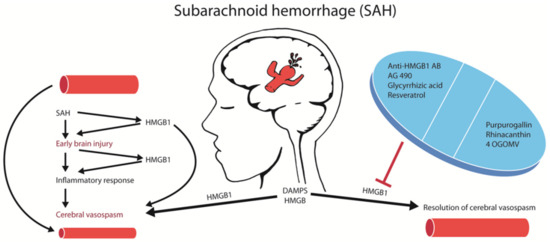 The experimental data suggest that HMGB1 inhibition is a promising strategy to reduce SAH-related brain damage and CVS. The brain accessibility of pharmacological agents targeting HMGB1 need to be evaluated in detail. Clinical studies are needed to validate this strategy in humans, and aid in the development of potential treatment options that are much needed in aSAH.