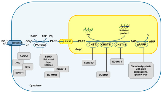 Genetic defects have been identified in several steps of PG biosynthesis, leading to a huge number of diseases that primarily affect cartilage and endochondral bone [12]. The cartilage phenotype might be explained by the high amount of sulfated PGs that are synthesized and deposited in the cartilage ECM. Among these disorders, diseases involving sulfate uptake, metabolic activation, and sulfation of GAGs are discussed in this review (Figure 2).