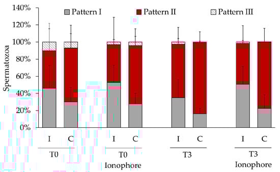 | Incubation Time (h) | Ionophore Treatment | Plasma Membrane Integrity | Analyzed Spermatozoa (n) | PTP Patterns | ||