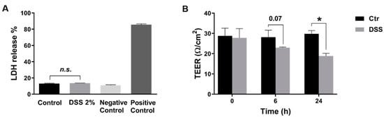 Dextran sulfate sodium (DSS) treatment disrupts intestinal epithelial barrier without affecting cell viability. (A) DSS does not affect the viability or the morphological characteristics of Caco-2 at a concentration of 2% (w/v), for 24 h, as assessed by the lactate dehydrogenase (LDH) assay. Negative control contains only media (without cells); positive control cells were lysed prior to adding the LDH reaction mix (B) The integrity of Caco-2 cells monolayer treated with DSS was measured by trans-epithelial electrical resistance (TEER). Students t-test, * p < 0.05, SEM, n = 3.