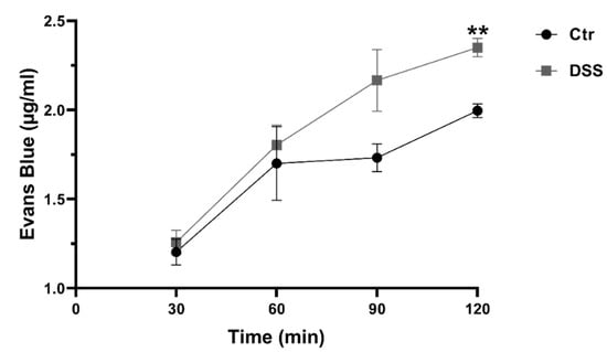 Dextran sulfate sodium (DSS) treatment alters the permeability of the intestinal epithelial barrier. The permeability of the epithelial barrier of Caco-2 cells was evaluated by Evans Blue (EB) permeability assay. DSS affected the cellular integrity negatively and caused a decrease in monolayer integrity as compared to the control (Ctr) non-treated cells. Student’s t-test, ** p < 0.01, SEM, n = 3.