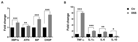 Dextran sulfate sodium (DSS) induces the expression of ER stress markers in Caco-2 cells and changes the balance of pro-inflammatory/anti-inflammatory cytokines. (A) Examination of ER stress markers by semi-quantitative RT-PCR. The ER markers X-box binding protein 1s (XBP1s), activation transcription factor 4 (ATF-4), immunoglobulin-binding protein (BiP), and C/EBP homologous protein (CHOP) were significantly elevated in Caco-2 cells incubated with DSS. (B) The expression of the pro- and anti-inflammatory cytokines, tumor necrosis factor-α (TNF-α), interleukin α (IL1α), interleukin 6 (IL6), and interleukin 10 (IL10). DSS treatment caused an elevation in the expression of the pro-inflammatory cytokines TNF-α, IL1α, IL6, whereas that of the anti-inflammatory cytokine IL10 was reduced as compared to control (Ctr) non-treated cells. Student’s t-test, * p < 0.05, ** p < 0.01, *** p < 0.001, SEM, n = 3.