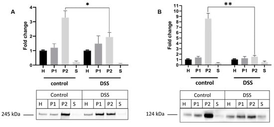 The sorting of sucrase-isomaltase (SI) and dipeptidyl peptidase-4 (DPPIV) is impaired in dextran sulfate sodium (DSS) treated Caco-2 cells. (A) Trafficking of SI to brush border membrane (BBM). (B) Trafficking of DPPIV to BBM. Caco-2 cells were treated or not treated with DSS. The cellular homogenates (H) were separated into intracellular and basolateral membranes (P1) or BBM (P2) using CaCl2. The fractions were subjected to Western blotting using anti-SI (A) or anti-DPPIV (B) antibodies. S represents soluble and vesicular (endosomal) proteins. Upon DSS treatment, a substantial decrease in the expression levels of SI and DPPIV is observed in BBM (P2 fractions). (Student’s t-test, * p < 0.05, ** p < 0.01, SEM, n = 3).