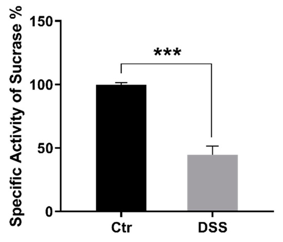 The specific activity of sucrase-isomaltase is reduced in BBM/P2 fractions. Caco-2 cells were treated or not treated with dextran sulfate sodium (DSS). The cellular homogenates were separated into intracellular+ basolateral membranes and brush-border membranes (BBM/P2) using CaCl2. The specific activity of sucrase-isomaltase (SI) versus sucrose as a substrate in BBM/P2 fractions was measured. The results revealed a 3-fold approximate significant reduction of SI activity in DSS-treated Caco-2 cells in comparison to the control (Ctr) non-treated cells. Student’s t-test, *** p < 0.001, SEM, n = 3.