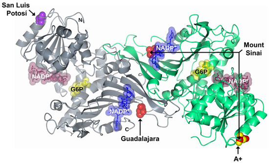 In Mexico, the presence of 19 different mutants has been reported, which have been found in several parts of the country, including single nucleotide substitutions (missense variants) G6PD A+ (Asn126Asp), G6PD San Luis Potosi (Asn126Tyr), and Guadalajara (Arg387Cys), which have given rise to the double mutant G6PD Mount Sinai (Asn126Asp + Arg387Cys) [13,14]. It is important to note that the Class II G6PD San Luis Potosi and two Class I G6PDs, Guadalajara and Mount Sinai variants, have not been functionally and biochemically characterized.