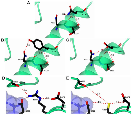 Structural comparison between human glucose-6-phosphate dehydrogenase (G6PD) enzyme (PDB entries 2BHL and 2BH9) and minimized models of Class I Guadalajara and Mount Sinai, Class II San Luis Potosi, and Class III A+. (A) Wild-type (WT) G6PD enzyme; (B) in silico N126Y mutation; (C) in silico N126D mutation; (D) WT G6PD enzyme; and (E) in silico R387C mutation. Note that double mutant R387C/N126D Mount Sinai is shown in (C,E). Residues are shown as black cylinders. Distances are in Å.