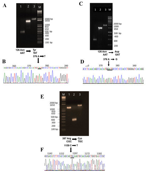 Site-directed mutagenesis for obtaining G6PD variants. (A) Amplicon resulting from polymerase chain reaction (PCR) in agarose gel electrophoresis (1%) for G6PD variant San Luis Potosi. Lanes 1 and 2. G6PD San Luis Potosi fragments. (B) Electropherogram of G6PD San Luis Potosi (A376, Asn→Tyr). (C) Variant G6PD A+. Lanes 1 and 2 G6PD A+ fragments. (D) Electropherogram of G6PD A+ (A376G, Asn→Asp). (E) Variant G6PD Guadalajara. Lanes 1 and 2 G6PD Guadalajara fragments. (F) Electropherogram of G6PD Guadalajara (C1159T, Arg→Cys). Line marked M in agarose gel electrophoresis corresponds to the Marker O’GeneRuler 1kb DNA ladder (Thermo Scientific) and line marked 3 corresponds to amplification of full-length G6PD.