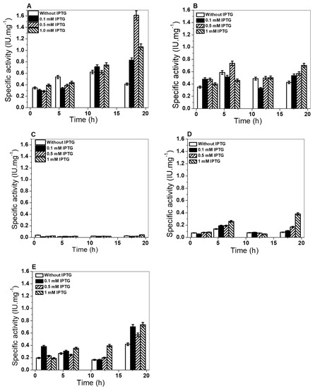 To characterize the single mutants G6PD A+ (Asn126Asp), G6PD San Luis Potosi (Asn126Tyr), and Guadalajara (Arg387Cys) and the double mutant G6PD Mount Sinai (A Asn126Asp + Arg387Cys), we first determined the optimal conditions of soluble proteins using specific activity as an indicator. Also, we compared it against the WT G6PD. In these assays, the cells were induced with different conditions of isopropyl-β-D-tiogalactopiranoside (IPTG) at different incubation times, as has been reported by Gomez-Manzo et al. [19]. As shown in Figure 4B, for the G6PD A+ variant, specific activity of 0.75 UI*mg−1 was obtained with 0.5 mM of IPTG; meanwhile, for the G6PD San Luis Potosi variant (Figure 4C), specific activity of 0.064 UI*mg−1 was obtained from crude extract with 1 mM of IPTG, reaching maximum specific activity at 6 and 18 h of incubation of both enzymes.