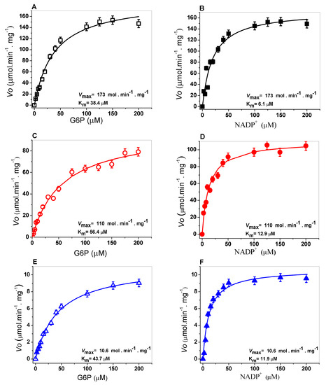 Finally, saturation curves for the double mutant G6PD Mount Sinai (Class I) were performed and the kinetic parameters generated by the double mutation in the protein were determined. A decrease in the catalytic constant of 94% (kcat = 13.9 s−1) was observed. Furthermore, the affinity values determined for the substrates NADP+ and G6P were lower Km NADP+ = 41.7 µM (Figure 5J) and Km G6P = 27.1 µM (Figure 5I) concerning the WT G6PD enzyme.