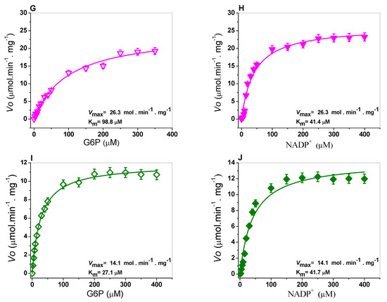 Kinetic characterization of (A,B) human G6PD WT and three single mutants: (C,D) G6PD A+ (Asn126Asp), (E,F) G6PD San Luis Potosi (Asn126Tyr), (G,H) G6PD Guadalajara (Arg387Cys); and (I,J) double mutant G6PD Monte Sinai. Initial velocities (Vo) of each concentration of G6PD physiological substrate (G6P and NADP+) were fitted to the Michaelis–Menten equation by nonlinear regression calculation to obtain Vmax and Km values. All assays were performed in triplicate.