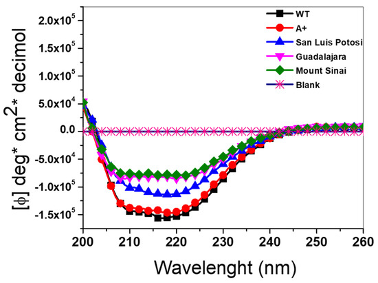 Circular dichroism (DC) assay was performed to determine if the loss in catalytic activity of the four recombinant G6PD variants was due to alterations in the secondary structure provoked by the change in amino acid residue in each variant. Figure 6 shows the spectra of the three single mutants G6PD A+ (N126D), San Luis Potosi (N126Y), and Guadalajara (R387C) and the double mutant G6PD Mount Sinai (N126D/R387C) plus the WT enzyme. We observed that all G6PD mutants had an absorption pattern at 208 and 222 nm, reflecting a protein with α-β conformation similar to the WT G6PD. However, all G6PD mutants (except for the A+ variant) showed minimum absorption signals, which indicates that an effect in the secondary structure caused by these mutations was observed as a change in absorption of the variants with respect to the absorption of the WT G6PD enzyme on the molar ellipticity (ϕ) in spectra of 222 nm and 208 nm for the α−helices and β−sheets, respectively, which may explain the decrease in catalytic efficiency.