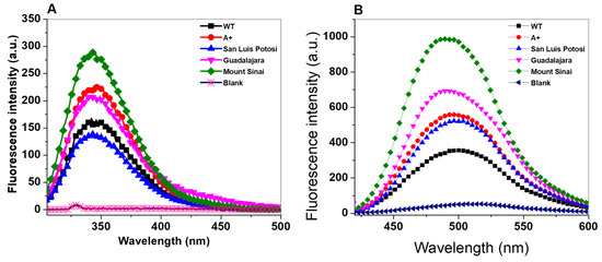 To determine the effects of the four mutations on the tertiary structure of the proteins, intrinsic fluorescence assays and 8-anilinonaphthalene-1-sulfonate (ANS) binding assays were performed to monitor the conformations on the tertiary structure. Both assays were performed on a Perkin-Elmer LS-55 fluorescence spectrophotometer (Perkin Elmer, Wellesley, MA, USA) equipped with a quartz cell and a step length of 1 cm [11,15,25,33]. The intrinsic fluorescence assay of WT G6PD and the four variants was performed using a final protein concentration of 0.1 mg/mL variant in 50 mM phosphate buffer at pH 7.35 at 25 °C. The excitation wavelength used for the samples was 295 nm and fluorescence emission was obtained from 300–500 nm with 4.5 and 3.7 nm slits for excitation and emission, respectively. Background fluorescence from the buffer (blank) was subtracted from those containing the respective protein [11].
