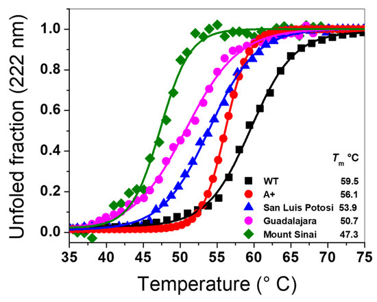 To analyze the effect of mutations on the structural stability of G6PD in the single mutants G6PD A+, San Luis Potosi, Guadalajara, and the double mutant G6PD Mount Sinai, we determined the changes in the structure of G6PD by DC at 222 nm, measuring the unfolded fraction of the α-helices through a temperature gradient (35–75 °C). The thermal denaturation of the G6PD proteins was followed by calculated Tm values, defined as the temperature at which half the α-helices remain in the native state and the other half are in an unfolded state. As shown in Figure 8, the Tm value calculated for the WT G6PD enzyme was 59.5 °C. We also calculated the Tm values, which are: 56 1 °C, 53.9 °C, 50.7 °C, and 47.3 °C for the single mutants G6PD A+, San Luis Potosi, and Guadalajara, and the double mutant G6PD Mount Sinai, respectively. Also, we observed a loss in Tm value of 3 °C, 6°, 10 °C, and 12 °C for G6PD A+, San Luis Potosi, Guadalajara, and G6PD Mount Sinai with respect to WT G6PD enzyme. These results indicate that the four G6PD mutants are more susceptible to denaturation by the temperature because these mutations made the three-dimensional (3D) structure are less stables with respect to WT G6PD. Once again, we observed that the stability of G6PD Mount Sinai (loss of 12 °C) was mainly due to the effect of G6PD Guadalajara (loss of 10 °C), and a slight additive effect of G6PD A+ was observed (loss of 3 °C). Furthermore, we determine the folding free energy which is an important biophysical characteristic of proteins that reflects the overall stability of the 3D structure of macromolecules [23]. The change of folding free energy (WT- mutant (MT)) determined for the Class III G6PD A+ variant (N126D) was −1.022166 kcal/mol; while that for the Class II G6PD San Luis Potosi variant (N126Y) a value of 0.613107 kcal/mol was determined. Finally, we determined a change of folding free energy of −9.000645 kcal/mol for the Class I G6PD Guadalajara variant (R387C). These values of change of folding free energy for all the mutants indicate that the change in the arginine residue by cysteine 387 (Arg→Cys) located in the binding site of structural NADP+ of the 3D structure suggest that the mutation destabilizes the protein respect to WT G6PD enzyme. In addition, these changes of folding free energy obtained are in concordance with the results previously showed, where higher alterations in secondary structure, a higher increase both in intrinsic and extrinsic fluorescence assays and a lower thermal stability for the single natural mutant R387C (G6PD Guadalajara) was observed respect to single natural variants G6PD A+ (N126D) and G6PD San Luis Potosi (N126Y). Finally, we observed that the effect of the mutations on stability of the G6PD protein was proportional to the loss of catalytic activity, secondary structure, and thermal stability where the single G6PD A+ variant showed catalytic activity around 50% with respect to WT G6PD enzyme; while G6PD San Luis Potosi, G6PD Guadalajara, and G6PD Mount Sinai showed a loss in catalytic constant of around 90%–95%.