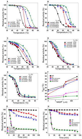 Thermal characterization of three single mutants and a double mutant of G6PD. (A) WT G6PD, (B) G6PD A+, (C) G6DP San Luis Potosi, (D) Guadalajara, and (E) G6PD Mount Sinai. The recombinant variants were incubated with different concentrations (0–500 µM) of NADP+ as a stability molecule for 2 h at 37 °C. Residual activity was plotted as percentage activity to calculate T50 value of each mutant. (F) To determine changes in T50 value of each variant, this was plotted against NADP+ concentrations. Thermal inactivation of G6PD variants through time (G) without NADP+ and (H) with 10 µM of NADP+. Assays were performed in triplicate.