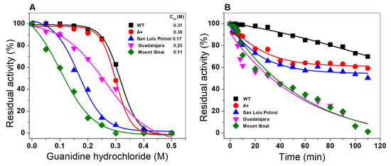 The effect of the mutations on the stability of the WT G6PD enzyme was evaluated in the presence of chemical denaturant guanidine hydrochloride (Gdn-HCl). This assay has been used to determine the conformational stability of proteins because this alters the tertiary structure and therefore the catalytic activity is disturbed. As shown in Figure 10, a sigmoidal decay of the residual activity of the WT G6PD enzyme and the single natural variants G6PD A+, G6PD San Luis Potosi, and G6PD Guadalajara and double mutant Class I G6PD Mount Sinai decreased when the concentration of Gnd-HCl was increased. From the plot, we calculated the C1/2 values, which lets us calculate the values of C1/2 (concentration of Gnd-HCl at which the protein loses 50% of its residual activity at 2 h of incubation at 37 °C). The C1/2 values obtained were 0.31 M for the WT G6PD enzyme, and 0.30, 0.17, 0.25, and 0.11 M, respectively, for G6PD A+, G6PD San Luis Potosi, G6PD Guadalajara, and Mount Sinai (Figure 10A). As expected, the WT G6PD enzyme was most stable in the presence of Gnd-HCl. However, we observed that the single natural variant Class III G6PD A+ presented similar behavior to the WT G6PD enzyme because their C1/2 values are similar. On the other hand, it can be inferred the variant G6PD A+ (N126D) by itself does not show a loss of stability compared with the wild enzyme, but analyzing the mutation (A376T) originating from G6PD San Luis Potosi (N126Y), it is denaturalized 1.8 times faster than the WT G6PD enzyme, losing around of 90% of its residual activity when incubated at 0.3 M Gnd-HCl for 2 h; therefore, the mutation’s effect is to make it more susceptible to decreased residual activity due to denaturation. For G6PD Guadalajara and Mount Sinai, we observed a loss in residual activity of 1.2 and 2.8 times compared with the WT G6PD enzyme. These results again suggest that the double mutant G6PD Mount Sinai and single natural variant G6PD Guadalajara are probably more affected by the loss of catalytic activity and structural stability than the single mutants G6PD A+ and G6PD San Luis Potosi with respect to WT G6PD enzyme.
