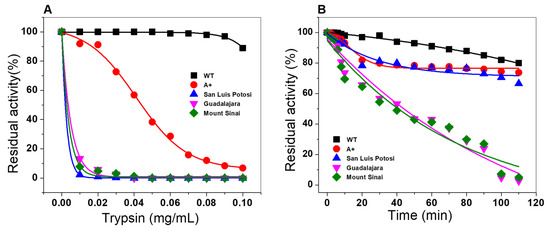 To assess the effect of the mutations on protein stability, proteolytic susceptibility assays were performed with trypsin digestion protease in the absence or presence of physiological NADP+ concentration (10 µM). As seen in Figure 11A, when the three single natural variants and the double mutant were incubated with trypsin at different concentrations, all four variants became more susceptible to trypsin digestion, compared with the native enzyme (Figure 11A). The most susceptible variants were G6PD San Luis Potosi, G6PD Guadalajara and the double mutant G6PD Mount Sinai, where 100% of the initial activity was lost when the enzyme was incubated with 0.03 mg/mL of trypsin (6 units); the G6PD A+ variant showed more resistance to the trypsin digestion, losing 100% when it was incubated with 0.1 mg/mL of trypsin (19 units). It is interesting to note that at the same concentration of trypsin, WT G6PD showed residual activity of 100% as expected. These results indicate that the three single natural variants and the double mutant displayed high susceptibility to trypsin digestion compared to the native enzyme.