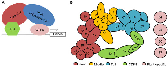 As sessile organisms, plants are able to adapt to changes around them, including decrease of nutrient and water content, increase of salt content in soil, or changeable temperature and light intensity [1]. At the molecular level, when plants perceive dangerous signals from the environment, the expression of numerous immune-related genes is activated to respond to the harsh environment stresses. The alterations in the regulation of gene expression are controlled by lots of cofactors of RNA polymerase II (RNAP II or Pol II), including the Mediator complex. The regulation of Mediator complex mainly occurs at the transcriptional level, and it is also conserved in eukaryotes. It first recruits transcription factors through protein-protein interaction, and then those transcription factors bind to the specific sites of target genes. The other part of Pol II transcription complex works to act in the transcription process to activate or repress the target genes in plants [2,3]. During this process, the Mediator complex is considered as the most important linker between Pol II and transcription factors (Figure 1A). The Mediator also functions in stabilizing the transcription initiation complex, DNA bending, transcription elongation, transcription termination, and chromatin-associated DNA remodeling [4].