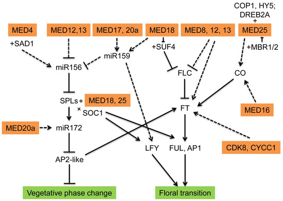 Floral transition, the transition from the vegetative phase to the reproductive phase, is controlled by at least five signaling pathways, including photoperiod, vernalization, gibberellin, aging, and the autonomous pathway. These flowering signaling pathways converge at some floral integrator genes, including CONSTANS (CO), FLOWERING LOCUS C (FLC), SUPPRESSOR OF OVEREXPRESSION OF CONSTANS 1 (SOC1), FLOWERING LOCUS T (FT), AGAMOUS-LIKE24 (AGL24), LEAFY (LFY), APETALA1 (AP1), SEPALLATA3 (SEP3), FRUITFULL (FUL), SHORT VEGETATIVE PHASE (SVP), miR156, SPLs, and miR172 [24,46,47,48,49]. Most Mediator mutants have late flowering phenotypes, including med8, med12 (cct), med13 (gct), med15, med16, med17, med18, med20a, med23, med25, and med30 [7], whereas the med2 and med5ab mutants are early flowering. Some of these Mediators function in multiple flowering pathways (Figure 2, Table 1).