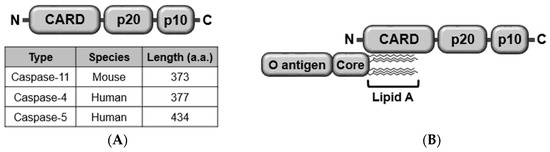 Similarly to canonical inflammasomes, caspase-11 non-canonical inflammasome is also activated in response to stimulating molecules. Lipopolysaccharide (LPS) was the first molecule identified to activate caspase-11 non-canonical inflammasome by direct interaction. LPS is a cell wall component and endotoxin derived from Gram-negative bacteria consisting of three structural domains: lipid A, core, and O antigen. LPS activates caspase-11 non-canonical inflammasome by interaction between lipid A and CARD of caspase-11 (Figure 1B