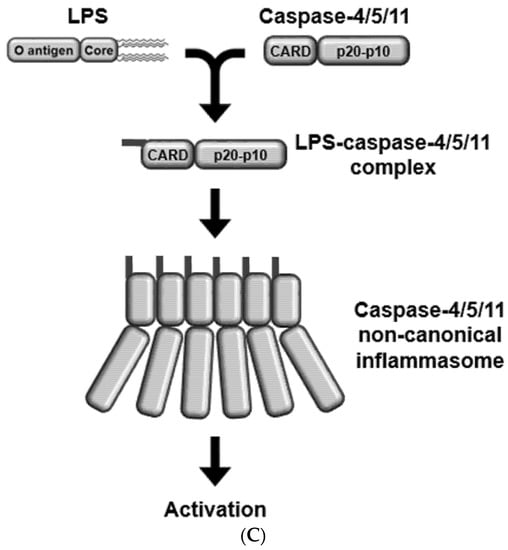 caspase-11, caspase-4/5 also interact with LPS, leading to the activation of caspase-4/5 non-canonical inflammasomes [19]. The recognition of LPS by caspase-4/5/11 then results in the activation of caspase-4/5/11 non-canonical inflammasomes via the oligomerization of LPS-caspase-4/5/11 complexes (Figure 1C).