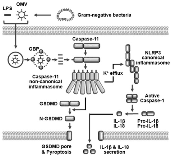 The inflammasome is categorized into two main groups: The first category is canonical inflmmasomes that include absent in melanoma 2 inflammasome, pyrin inflammasome, and NLR family inflammasomes, such as NLRP1, NLRP3, NLRC4, and NLRP6 inflammasomes. Canonical inflammasomes were discovered earlier, and a large number of studies have demonstrated that they play a pivotal role in inflammatory responses and the pathogenesis of various inflammatory diseases [15,16,17]. A new class of inflammasomes with roles similar to those of canonical inflammasomes was unexpectedly discovered, however, the stimulating PAMPs and the underlying mechanism of inflammatory responses mediated by these inflammasomes is different from the canonical inflammasomes. Therefore, these new inflammasomes were named ‘non-canonical’ inflammasomes and include mouse caspase-11 and human caspase-4 and -5 that are considered as homologues of mouse caspase-11 [18,19].