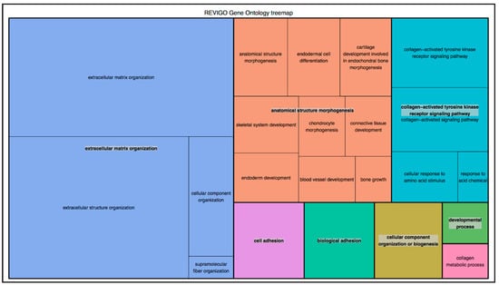 Tree-map of pathways clustered by semantic similarity from the set of collagen Differentially Expressed Genes (DEGs). The plot shows three super-clusters, namely Extracellular Matrix Organization, Anatomical Structure Morphogenesis, Collagen-activated Tyrosine Kinase Receptor Signaling Pathway and several clusters, such as Cell Adhesion and Collagen Metabolic Process. The prioritization of the three genes of interest followed the interpretation of this functional analysis. The size of the rectangles reflects the absolute log10p. These data have been extracted from the RNA-seq dataset published by Tsoi et al., 2019 [].