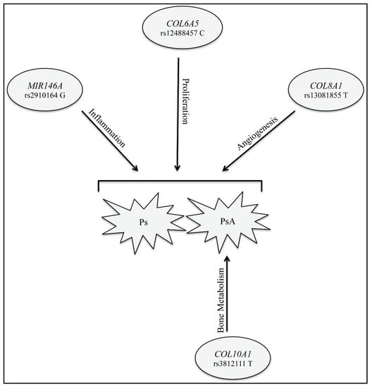 MIR146A, COL6A5, COL8A1 contribute to the susceptibility to both Ps and PsA, with an effect on the inflammation, proliferation and angiogenesis processes, respectively. COL10A1 is involved in the etiopathogenesis of PsA through its role in bone metabolism.