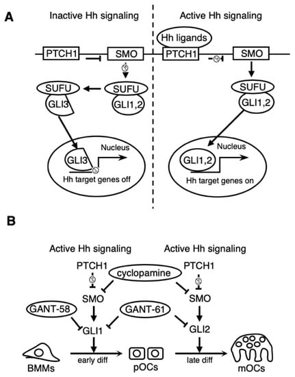 - Ohba, S.; Kawaguchi, H.; Kugimiya, F.; Ogasawara, T.; Kawamura, N.; Saito, T.; Ikeda, T.; Fujii, K.; Miyajima, T.; Kuramochi, A.; et al. Patched1 haploinsufficiency increases adult bone mass and modulates Gli3 repressor activity. Dev. Cell 2008, 14, 689–699. [Google Scholar] [CrossRef]