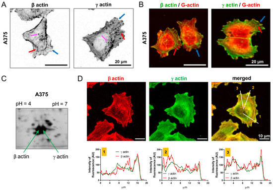 Differing distribution of non-muscle isoactins in A375 cells. (A) The cells were stained with antibodies detecting β and γ actin isoforms. Pink arrows point at invadopodia, red ones at stress fibers and blue ones at lamellipodia. (B) A375 cells growing on coverslips were fixed and stained to detect β or γ actin and globular actin by using appropriate antibodies and DNase I coupled to Alexa Fluor™ 594. Red arrows highlight stress fibers and blue ones lamellipodia. (C) Total protein extract from A375 cells (twenty μg of protein) was subjected to 2-D PAGE. The gel was stained with silver. (D) Immunocytochemically stained cells to detect β and γ actin. Three lines were drawn on a merged photo of the cell and the fluorescence histograms representing signal intensities for every fluorochrome were prepared on this basis.