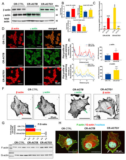 In order to test the hypothesis that β and γ actin have different functions in A375 cells, we decided to knock out the ACTB and ACTG1 genes via the CRISPR/Cas9(D10A) technique. We successfully obtained these lines, which we confirmed by genomic DNA (gDNA) (Figure S3A), Western blot (Figure 2A,B and Figure S3B), and qPCR (Figure 2C) analyses and by immunocytochemical staining of the obtained clones (Figure 2D and Figure S4). Apart from cells devoid of β and γ actin synthesis, we also obtained control cells, i.e., clones transfected with CRISPR/Cas9(D10A) plasmids that code for scrambled guide RNAs, gRNAs. The control clones had normal levels of both of the non-muscle actins (Figure S3C). Interestingly, we observed compensation after the depletion of one isoform, i.e., upregulation of the level of the other isoform. This was seen in both the Western blot (Figure 2A,B) and microscopic analyses (Figure 2D,E, Figure S4). In the Western blot analysis, we observed this occurrence only if we lysed the cells in the lysis buffer used for 2-D PAGE, which contains high levels of urea and thiourea and, thus, better extracts the proteins associated with the detergent-resistant membrane fractions of the cells. When we used cytoskeletal-bound protein extraction buffer, we did not observe any compensation (Figure S5). For all the other Western blot analyses, we used cytoskeletal-bound protein extraction buffer. A closer look at the stained cells revealed (Figure 2F) that in the case of CR-ACTB [clones with inactivated ACTB with the help of CRISPR/Cas9(D10A) technique] cells, the elevated levels of γ actin manifested more prominently in structures that are characteristic for this isoform, as shown in Figure 1A,B. A similar observation was made for the β actin distribution in A375 CR-ACTG1 [clones with inactivated ACTG1 with the help of CRISPR/Cas9(D10A) technique] cells. Here, the stress fibers’ formation was more pronounced than in the control cells (Figure 2F); this was reflected in the elevated filamentous (F) to globular (G) actin ratio (Figure 2G) and more pronounced staining for F-actin (Figure 2H) in CR-ACTG1 cells. In the case of the cells without β actin, the F:G actin ratio was unchanged in comparison to the control cells (Figure 2G) and the F-actin staining patterns were similar between the CR-ACTB clones and control cells (Figure 2H). These results show that the CRISPR/Cas9(D10A) technique is suitable for knocking out ACTB and ACTG1 and that the obtained clones have altered actin cytoskeleton architecture.