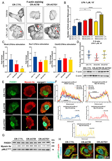 Subsequently, we checked the formation of F-actin-rich structures as they are directly involved in cell motility. We incubated cells that were starved for 24 h with 1 micromolar (μM) lysophosphatidic acid (LPA) for 10 min in order to challenge the cells to form stress fibers [23]. This was achieved (Figure 4A), and we calculated the number of “thick” stress fiber bundles, plotting a histogram of fluorescence over the cell length and identifying the number of fluorescent values that were higher or equal to 75% of the highest fluorescence peak. The highest number of these structures was noted in the CR-ACTG1 clones with LPA stimulation (Figure 4B). Interestingly, in the case of control cells and CR-ACTG1 cells, there were more thick stress fiber bundles after stimulation than in nonstimulated cells, whereas this was not true in the CR-ACTB cells. We then looked at activation of Rho-GTPases upon LPA stimulation, as LPA is a Rho activator [23]. After the addition of LPA, a statistically significant decrease in the level of active RhoA was observed only in the CR-ACTG1 cells (Figure 4C). The levels of Rac1 and Cdc42 activity were similar between the clones (Figure 4C). Next, we evaluated the F:G actin ratio; this ratio was similar in all three cell types (Figure 4D), although there was a tendency toward a decrease for the CR-ACTB cells. Next, we looked at the distribution of the human FH1/FH2 domain-containing protein 1, FHOD1, formin (a microfilament bundling and capping protein [24]), and Myosin IIa, an actin motor protein that possesses microfilament bundling activity [25]. While we did not observe any changes in the cellular distribution of FHOD1, the Myosin IIa staining pattern was altered in CR-ACTG1 cells (Figure 4E). The signal for Myosin IIa in these cells was not homogenously distributed, as in the control cells, but instead clear, thick bundles were seen. Although this was not reflected in the results of the analysis of averaged histograms, which represent the fluorescence signal of detected FHOD1 or Myosin IIa, it was mirrored in the plot profiles of representative cells for every condition (Figure 4F). Moreover, the FHOD1 and Myosin IIa levels were similar in the CR-ACTB, CR-ACTG1, and control cells (Figure 4G, Figure S9). We also checked the phosphorylated myosin light chain (pMLC) levels, as pMLC is an indicator of myosin ATPase activity and, thus, activation of the contractile apparatus [26]. The pMLC levels were similar among all the cell types (Figure 4G, Figure S9). Although there were no differences in the levels of Myosin IIa or pMLC between the different clones after LPA stimulation, when grown in full medium, significantly higher levels of Myosin IIa and pMLC were exhibited by the CR-ACTB cells and the CR-ACTG1 clones had lower basal levels of FHOD1 (Figure S10). Finally, we stained the cells for pMLC and we noticed a strong decoration of stress fibers with pMLC in control and CR-ACTG1 cells, but not in the CR-ACTB clones (Figure 4H). These observations imply that the formation rate of stress fibers is more enhanced in the cells devoid of γ actin than in control cells or cells without β actin.