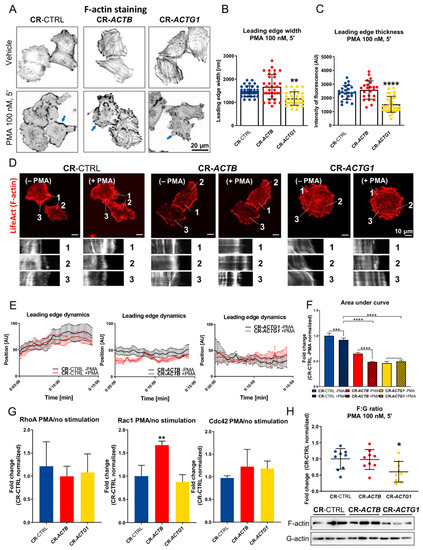 Since we checked the clones’ ability to form stress fibers, we also looked at the other F-actin protrusive structures, lamellipodia. Phorbol-12-myristate-13-acetate (PMA) stimulation was performed to induce formation of lamellipodia [27]. F-actin staining in fixed cells and analysis of micrographs revealed that cells devoid of γ actin formed narrower and thinner leading edges than did control cells (Figure 5A–C). The width and the thickness of lamellipodium were measured by plotting a histogram of fluorescence over the lamellipodium, and using a ruler in the software or reading the whole intensity of fluorescence through the lamellipodium, respectively. In the case of the CR-ACTB cells, there were no differences in these aspects compared to controls. Afterwards, we performed live imaging analysis of clones that were transfected with a plasmid that encoded LifeAct-TagRFP in order to track F-actin in real time upon PMA stimulation. Analysis of the kymographs (Figure 5D) showed that the dynamics of F-actin within the leading edge were more prominent in CR-ACTB cells than in control cells (Figure 5D–F). Although, in the CR-ACTG1 cells, there was no difference in the lamellipodial dynamics between the PMA-stimulated and nonstimulated groups, the overall lamellipodial dynamics were lower in those cells in comparison to those present in the controls (Figure 5F). Next, we evaluated the activation of Rho-GTPases upon PMA stimulation versus nonstimulated cells. We evaluated activity of GTPases with activation assays (G-LISA®) detecting given GTPase bound with GTP in cells lysates. Increased Rac1 activity was noted in CR-ACTB cells (Figure 5G); however, we did not observe any changes in the RhoA or Cdc42 activity between the clones in response to PMA treatment. The F:G actin ratio was also checked and a statistically significant decrease was noted only for the CR-ACTG1 cells (Figure 5H). Altogether, these observations imply that while the leading edge dynamics were increased in CR-ACTB cells, the opposite effect was observed for CR-ACTG1 cells, when compared to control cells.