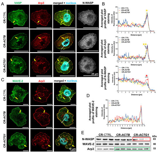 Because we noticed divergences between the clones in terms of their leading edge dynamics, we decided to look at proteins that trigger actin polymerization and reside in the leading edge. Upon exposure to PMA, the cells were fixed and stained for vasodilator-stimulated phosphoprotein (VASP) and actin-related protein 3 (Arp3) as these proteins are the nucleators of actin polymerization within the lamellipodium [28]. We found that both proteins were prominent at the leading edges of all the analyzed cell types; however, the presence of VASP was more pronounced in the CR-ACTG1 clones, whereas the Arp3 level was diminished in these cells (Figure 6A,B). The presence of neural Wiskott-Aldrich syndrome protein (N-WASP) and Wiskott-Aldrich syndrome protein family member 2 (WAVE-2), two activators of Arp3, was also evaluated; while the amount of N-WASP was significantly increased at the leading edges of CR-ACTB cells, there were no observed differences in the amount of WAVE-2 between the tested clones (Figure 6C,D). Interestingly, we observed that VASP colocalized with Arp3 within circular dorsal ruffles (CDRs) in all the tested clones (Figure 6A). We also noticed the presence of Arp3 and WAVE-2 at the leading edges and CDRs in all the tested clones (Figure 6C). Western blot analysis showed that there was less N-WASP in the CR-ACTG1 cells, whereas the level of Arp3 was increased in the CR-ACTB and CR-ACTG1 clones, compared to controls (Figure 6E, Figure S11). We also checked the levels of those proteins under full medium conditions. The level of N-WASP was significantly statistically higher in both the CR-ACTB and CR-ACTG1 cells when compared to control clones (Figure S12). Similarly, there was an increase in the level of Arp3 in both CRISPR clone types when compared to controls. There were no notable changes in the levels of WAVE-2 between the cell types (Figure S12). These observations suggest that alterations in the leading edge dynamics could be at least partially caused by changes in the subcellular distribution and amount of the proteins studied here.