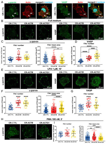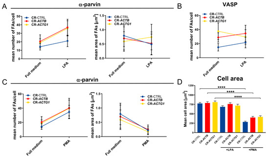 Subsequently, we compared the results for all the clones concerning the numbers and sizes of FAs upon LPA or PMA stimulation under full medium conditions by employing slope graphs. We observed the same tendency for all the tested cells, i.e., LPA and PMA incubation increased the number of α-parvin-rich FAs and PMA treatment decreased FA size (Figure 8A,C). In the case of CR-ACTG1 cells, we noted, surprisingly, an increase in the size of α-parvin-rich FAs upon LPA stimulation when compared to controls and CR-ACTB cells, for which a decrease was noted (Figure 8A). Similarly, after LPA treatment, the number of VASP-rich FAs decreased in the cells devoid of γ actin and increased in the control and CR-ACTB cells (Figure 8B). These results indicate that FA formation differed between the clones and that CR-ACTG1 cells had impaired FA turnover.