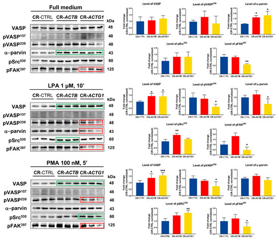 Consequently, to follow on the observed changes in FA formation, we decided to check the levels of some FA structural proteins that play significant roles in FA-associated signaling, using Western blotting. We estimated the levels of VASP, phosphorylated VASP (pVASP157 and pVASP239, VASP forms without actin-binding activity [29]), α-parvin, and the phosphorylated forms of proto-oncogene tyrosine-protein kinase Src (Src) (pSrc530, inactive form of Src [30]) and focal adhesion kinase 1 (FAK) (pFAK397, active form of FAK [31]). In CR-ACTB and CR-ACTG1 cells, we observed elevated level of VASP under full medium, LPA, and PMA conditions (Figure 9). Although we did not observe any signal for pVASP157, we noted a lower level of pVASP239 in the cells devoid of γ actin that were grown under LPA and PMA conditions (Figure 9). Interestingly, the α-parvin amount increased in the CR-ACTB and CR-ACTG1 clones that grew in full medium, but decreased in the cells without γ actin upon exposure to LPA. LPA incubation upregulated the pSrc530 level in β actin-deficient clones, but PMA stimulation upregulated pSrc530 in the γ actin-deficient clones. Next, we looked at FAK activation and we noticed a decrease in the pFAK397 level in CR-ACTG1 cells under all the tested conditions, compared to control cells. In summary, these results clearly show that altered FA formation in CR-ACTB and CR-ACTG1 clones has a direct impact on FA-associated signaling.