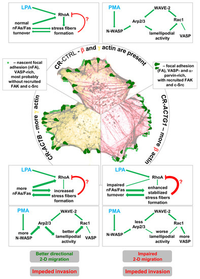 The activity of Rho-GTPases regulates the formation of F-actin-based structures (lamellipodia, filopodia, and stress fibers) and thus migration [52]. Here, however, we do not see a clear correlation between Rho-GTPase activity upon LPA and PMA treatment and the F:G ratio or the formation of lamellipodia and stress fibers in the tested clones. We believe that the observed alterations in Rac1 and RhoA activity are a downstream effect of the altered actin network dynamics in the clones devoid of β or γ actin due to two possible mechanisms (Figure 10). In the case of CR-ACTB cells challenged with PMA, there was more N-WASP at the leading edges of the cells, which allowed more Arp2/3 to be activated and this resulted in better lamellipodial activity. As a result, this could eventually lead to higher Rac1 activity in comparison to control and CR-ACTG1 cells since, as discussed by Dang and Gautreau, lamellipodial activity might have a positive feedback loop on Rac1 activity [53]. The downstream localization of Rac1 in the signaling cascade is further corroborated by the fact that the presence of WAVE-2, which is normally a downstream effector of Rac1 [52], at the leading edge was unchanged under these conditions. On the other hand, in the LPA-treated CR-ACTG1 clones, there were as many mature FAs (α-parvin-rich) as there were in the CR-ACTB cells, but they were bigger. Moreover, there was a smaller number of nascent FAs (VASP-rich) in CR-ACTG1 cells than in CR-ACTB cells. According to Wozniak and colleagues, Mena/VASP, together with Vinculin, act at nascent FAs (initial adhesions), whereas Src and FAK are recruited to adhesion sites later during the clustering of integrins [54]. Alternatively, at nascent FAs, kindlin, together with the integrin-linked kinase (ILK):LIM and senescent cell antigen-like-containing domain protein (PINCH):parvin complex [55] and/or the migfilin:VASP complex [56], associates with integrins at first and, following FAK and Src, associates with nascent FAs [55]. Here, however, we observed α-parvin’s presence at well-developed FAs. In accordance with the literature, FA formation activates RhoA [57], but FA size may not determine the range of RhoA activation, but instead the ability to form new FAs. However, the diminished activity of RhoA in CR-ACTG1 cells might not be solely caused by the altered FA turnover. We also assume that the extent of stress fiber formation somehow influences RhoA activity in a negative feedback loop as the highest number of thickly bundled stress fibers and lowest RhoA activity, in comparison to control cells, were noted for CR-ACTG1 cells. We want to stress our belief that, at the core, the observed phenotypes are probably due to the different properties of actin isoforms in terms of their interactions with ABPs. Interestingly, we did not observe any changes in Cdc42 activity in response to LPA or PMA stimulation, though there is an interplay between Rho-GTPases [58]. These would be in agreement with the notion that Rac1 and RhoA are mainly affected by the changes in dynamics of integrin-based structures [59] and here we observed disturbed FA formation/turnover.