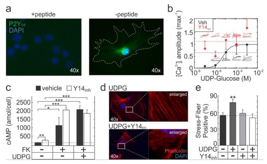 For immunofluorescence, formalin-fixed cultures (pH 7.4, 8 min) were blocked in 5% BSA/PBST (1 h) and incubated overnight (4 °C) with P2Y14 antibody (1:1000 dilution). Secondary anti-rabbit FITC-conjugated secondary antibody was applied for 1 h (room temperature). For actin visualization, fixed cultures were stained with 150 nM phalloidin (15 min, room temperature). Nuclei were counterstained with DAPI (5 min, rt). Stained cultures were visualized with an inverted fluorescent microscope (Nikon T2000, Tokyo, Japan) and stress fibre-positive cells were visually classified as those in which long fibres were observed along the major cellular axis [80].