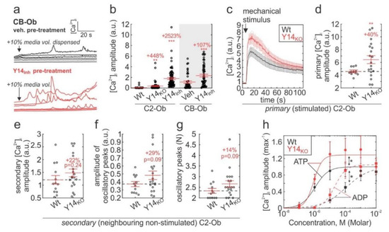 The lack of discernable dose-dependency that accompanied the potentiated UDPG-induced [Ca2+]i elevations in P2Y14-inhibited osteoblasts prompted us to investigate whether P2Y14 inhibition affects cellular sensitivity to mechanical stimulation that is known to induce purinergic signalling in bone cells [19]. We mechanically-stimulated osteoblasts by dispensing 10% media volume into Fura2-loaded osteoblast cultures (Figure 3a). This stimulus represented a relatively mild mechanical perturbation as indicated by a lack of response in untreated CB-Ob and Wt C2-Ob cultures. However, the same stimulus-induced pronounced [Ca2+]i elevations in Y14inh-treated and Y14KO cells (Figure 3b). Next, we mechanically-stimulated individual Fura2-loaded C2-Obs using a glass-micropipette, which we previously showed induces reversible cell membrane disruption [20], thus representing a more severe mechanical stimulus. The amplitude of mechanically-stimulated [Ca2+]i elevations in Y14KO C2-Ob cells was significantly higher than in Wt cells (Figure 3c,d). In addition, [Ca2+]i responses in neighbouring non-stimulated C2-Ob cells, which are mediated by ATP and ADP released from the mechanically-stimulated cell [19,20,59], tended to have more oscillatory peaks (p = 0.09) with greater magnitudes (p = 0.09) (Figure 3e–g). When ATP and ADP were applied directly to Fura2-loaded Wt or Y14KO cells, calcium responses to both agonists were significantly potentiated in Y14KO cultures (Figure 3h). These data suggest that P2Y14 negatively modulates mechanical and purinergic signalling in osteoblastic cells, and when P2Y14 signalling is suppressed, cells become hypersensitive to stimulation.