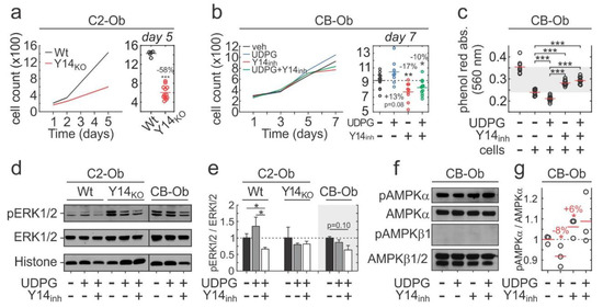 To assess the functional outcomes of P2Y14 signalling, we first examined its role in cell proliferation. Cell counts were significantly reduced in Y14KO compared to Wt C2-Ob cells (Figure 4a). Similarly, pharmacological inhibition in CB-Obs resulted in significantly reduced cell numbers on day 7 of culture, although the effect was of lower magnitude compared to Y14KO (Figure 4b). UDPG treatment increased CB-Ob cell counts, which was reversed in the presence of Y14inh (Figure 4b). As a measure of metabolic activity, we evaluated absorption of phenol red in conditioned media sampled from day 7 CB-Ob cultures and observed significant reductions in 560 nm absorption in UDPG-treated cultures, indicating increased extracellular acidity (Figure 4c). These effects were reversed when P2Y14 activity was inhibited (Figure 4c). We next examined if P2Y14 affected mitogenic or metabolic signalling in osteoblasts. Immunoblot analysis showed that 15 min UDPG treatment stimulated P2Y14-dependent ERK1/2 phosphorylation (pERK1/2) in C2-Ob (Figure 4 d,e). In CB-Obs UDPG did not induce any discernable changes in pERK1/2, however, inhibition of P2Y14 resulted in a tendency towards reduced pERK1/2 (p = 0.10). AMPK phosphorylation (pAMPK) was previously reported to suppress proliferation [60]. Stimulation with UDPG for 48 h leads to a significant reduction in pAMPKα levels in CB-Ob cultures, while the inhibition of P2Y14 had the opposite effect (Figure 4f,g).