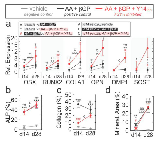Role of P2Y14 in osteogenic differentiation. Bone marrow-derived cells were cultured with or without osteogenic factors (50 µg/mL ascorbic acid, AA; 2 mM β-glycerol phosphate, βGP) and 100 nM PPTN (Y14inh) and osteogenic phenotype was evaluated at days 14 and 28. (a) Top: description of symbols representing specific comparisons; the level of significance is indicated by single (p < 0.05), double (p < 0.01) or triple (p < 0.001) symbols. Bottom: gene expression of osteogenic markers assessed by RT-PCR at days 14 and 28 post-osteogenic induction. Data means ± sem, normalized to d14 vehicle condition; n = 5 independent cultures. (b,c) Cultures were fixed and stained for alkaline phosphatase (b; ALP), collagen (c; Sirius red stain) and mineralization (d; alizarin red stain). Stained cultures were visualized by brightfield microscopy, and surface coverage (%) was quantified; n = 5 independent cultures, with 2–5 fields of view quantified per culture.