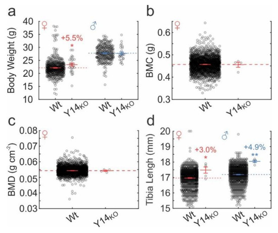 Skeletal phenotype of P2Y14 mutant mice. Wt and Y14KO mouse phenotype data were obtained from the IMPC database. (a) body weight (9 week-old mice). n = 288–556 Wt, 24–27 KO mice/sex. (b) Bone mineral content, BMC (13–14 week-old mice). n = 1814 Wt, 4 KO mice. (c) Bone mineral density, BMD (13–14 week-old mice). n = 1807 Wt, 4 KO mice. (d) Tibial lengths (13–14 week-old mice). n = 1061–1093 Wt, 5 KO mice/sex. Raw data and means ± sem are shown. Significance was assessed by pairwise t-test; * p < 0.05 or ** p < 0.01.