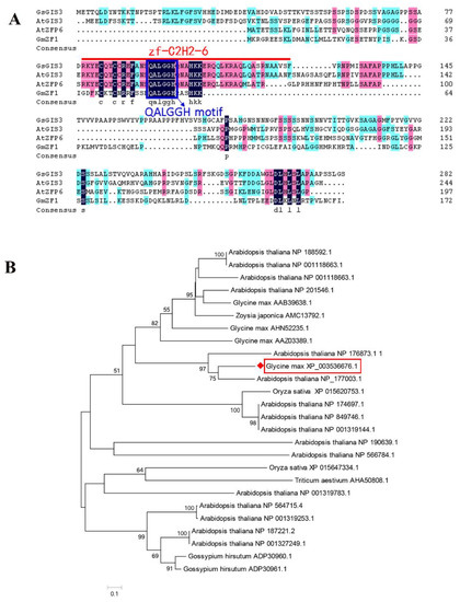 Amino acid sequence and phylogenetic analysis of GsGIS3. (A) The alignment of C2H2 zinc finger proteins. The position of the domain of zinc finger is labeled. GsGIS3 (XP_003536676.1), AtGIS3 (NP_177003.1), AtZFP6 (NP_176873.1), and GmZF1 (AAZ03389.1). (B) Phylogenetic analysis of GsGIS3 protein orthologs. The GsGIS3 protein is marked with a red box.
