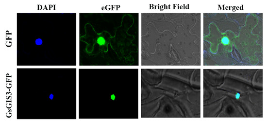 We predicted by using the online website that GsGIS3 protein was localized in the nucleus. To verify the exact subcellular localization of GsGIS3, we constructed the fusion expression vector pCAMBIA1302-GsGIS3-GFP and conducted transient expression in N. benthamiana leaf cells. As determined by the laser confocal microscopic observations, pCAMBIA1302-GsGIS3-GFP protein accumulated mainly in the nucleus with strong signals of green fluorescence. In contrast, GFP alone was distributed evenly throughout all parts of the cell including the nucleus and cytoplasm (Figure 2). The results show that GsGIS3 was localized within the nucleus, which suggests that the GsGIS3 protein may act as a transcription factor.
