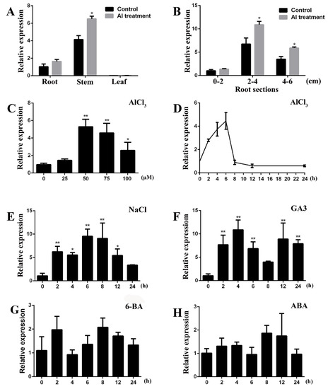 Expression characteristics of GsGIS3. (A) GsGIS3 expression levels in root, stem, and leaf of Glycine soja. (B) Expression levels of GsGIS3 in Glycine soja roots in different sections. (C) Pattern of GsGIS3 expression under Al concentration gradients. (D) Temporal expression pattern of GsGIS3 under acidic aluminum exposure. (E–H) Patterns of GsGIS3 expression under the different conditions of abiotic stresses: 200 mM NaCl (E); 100 μM GA3 (F); 100 μM 6BA (G); and 10 μM abscisic acid (ABA) (H). GsGIS3 transcript abundance was assessed by qRT-PCR using the 2–ΔΔCt method with the actin Actin3 gene as an internal control [40]. The data are represented as the averages of three independent biological experiments ± SD, and asterisks indicate a significant difference (* P < 0.05; * P < 0.01) compared with the corresponding controls.