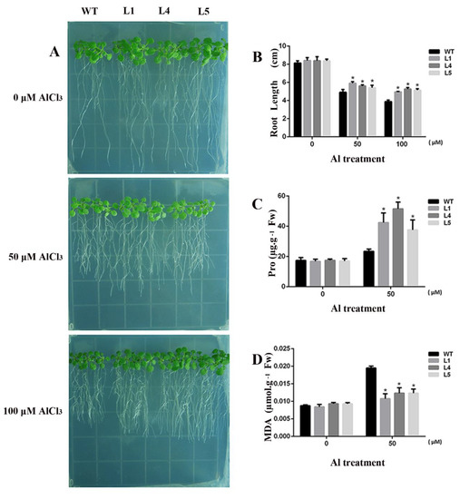 To explore the tolerance of GsGIS3 transgenic lines to Al stress, we identified the transcription levels of five homozygous transgenic lines and selected three lines with higher expression levels for subsequent experiments. Arabidopsis seedlings were treated at 0, 50 and 100 μM AlCl3 for seven days. Under the control growth conditions, no obvious difference was found between wild-type and transgenic Arabidopsis. Under treatment of 100 μM AlCl3, all Arabidopsis roots were inhibited in varying degrees compared to the control; the root length of wild-type plants was 3.4 cm, while the root lengths of GsGIS3 transgenic lines ranged from 4 to 4.5 cm (Figure 4A,B). The transgenic lines showed better growth than wild-type plants in Al stress. Furthermore, under the control conditions, no difference was found in both wild-type plants and GsGIS3 transgenic lines. The contents of proline and MDA were improved in Al stress. However, under 100 mM AlCl3 treatment, proline contents in WT plants increased to 23 μg·g−1 of fresh weight while the proline contents in transgenic lines ranged from 43 to 56 μg·g−1 of fresh weight in transgenic lines, (Figure 4C). In addition, under 100 mM AlCl3 treatment, MDA accumulation in WT plants improved to 0.019 μmol.g-1 of fresh weight, while MDA contents in GsGIS3 transgenic lines increased to the range of 0.010–0.013 mmol·g−1 of fresh weight in Al stress (Figure 4D). MDA in wild-type was significantly higher than that of transgenic lines.