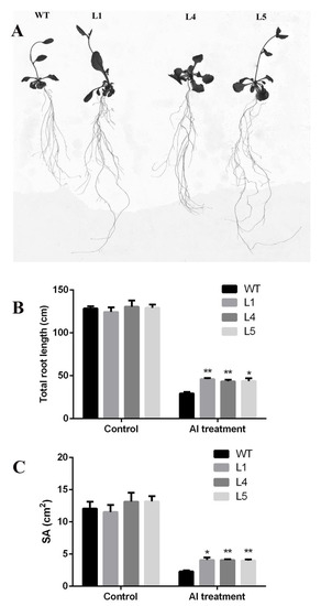 Phenotype observation and indexes determination. (A) The phenotype of transgenic lines and control in 1/30 Hoagland nutrient solution with 2 μM AlCl3. (B) The total root length. (C) The total root surface area. Asterisks indicate significant differences between WT and GsGIS3 transgenic lines (* P < 0.05; ** P < 0.01). WT, wild-type of Arabidopsis (Col-0); L1, L4 and L5 GsGIS3 Arabidopsis transgenic lines of T3 generations; SA, the total root surface area. Three independent biological experiments were carried out to investigate the status of seedlings and measure the root indexes.