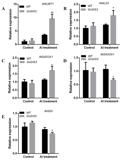 Expression Patterns of Al Stress/GA3-related Genes Regulated by GsGIS3: (A) AtALMT1 expression; (B) AtALS3 expression; (C) AtGA2XO1 expression; (D) AtGA3OX1 expression; and (E) AtGID1 expression. Asterisks indicate a significant difference (* P < 0.05; ** P < 0.01) compared with the controls.