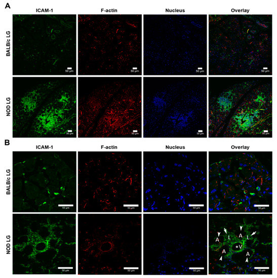 2.3. ICAM-1 Is Significantly Overexpressed in the LG of NOD Mice Compared with Healthy Mice