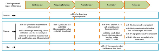 The development of human and mouse lungs are characterized by similar divisions spanning from pseudoglandular, canalicular, terminal saccular, to a final alveolar stage [11]. Regarding miRNAs involvement in lung morphogenesis, we discussed what is known in humans, mice, and rats (see Figure 1). Furthermore, profound genetic similarities have been reported between humans and the two rodents [13,14].